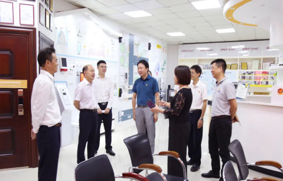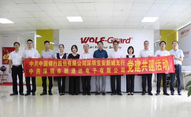 活动期间,中行领导一行在驰通达集团董事长万腾驰陪同下,实地参观考察了驰通达党建文化建设长廊和智慧安全防护演示厅,通过学习观摩与双向交流,进一步统一了双方党员干部的思想认识,更加深刻理解企业文化的内涵。中国银行深圳宝安支行钟俊副行长对驰通达党支部建设成果给予了充分肯定,对驰通达很早就获得深圳市、区、街道“两新工委先进基层党组织、街道先进基层党组织”等众多荣誉表示赞赏。驰通达集团董事长万腾驰表示,驰通达党支部已成为教育党员职工“争先创优”的重要阵地,驰通达始终坚持“把党员培养成骨干、把骨干发展为党员”的用人理念,让驰通达党员和企业员工时刻感受到党的温暖。此举与中国银行深圳新城支行党支部的理念不谋而合,作为党建结对共建单位,双方约定将以此次联创为契机,加强党组织与党员沟通交流,寻求价值认同、资源共享、优势互补,促进银企构建战略伙伴关系,在国外疫情防控持续的情况下,对结对共建单位给予授信额度支持,有效服务银企转型创新发展,实现合作共赢,进一步夯实党建工作基础。