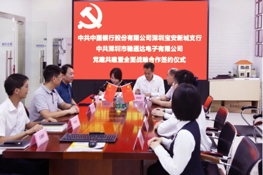 为深入贯彻落实党中央和上级党组织相关精神,充分发挥党组织的战斗堡垒作用和中共党员先锋模范作用,深化银企合作共同提高,2020年8月12日,中国银行股份有限公司深圳新城支行与天行平台党支部隆重举行党建结对共建暨全面战略合作签约仪式。出席本次签约仪式的中行领导有:宝安管辖支行钟俊副行长,新城支行李克华行长,新城支行陈莉副行长,新城支行黄程林副行长等;出席本次签约仪式的驰通达集团领导有:集团董事长、南山区人大代表万腾驰,集团行政总裁、党支部书记莫蓉,轮值ceo、法人代表熊剑,财务部经理陈晓东等支委成员。中行领导对本次党建共建活动给予高度重视和大力支持,并对受疫情影响导致部分出口业务受阻的企业给予大力的授信额度支持,对驰通达集团日常经营和平稳发展提供了很大的帮助,此行深入基层企业传经送宝更是难能可贵,万腾驰董事长对此表示大加赞赏和感谢!