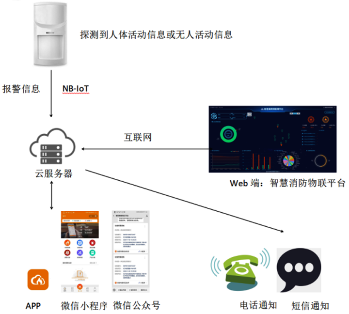 ②物联监控:可通过手机APP/web实时查看安装的红外人体感应报警等运行状况,也可对接其他物联监控,如烟感、视频监控、电气火灾等。